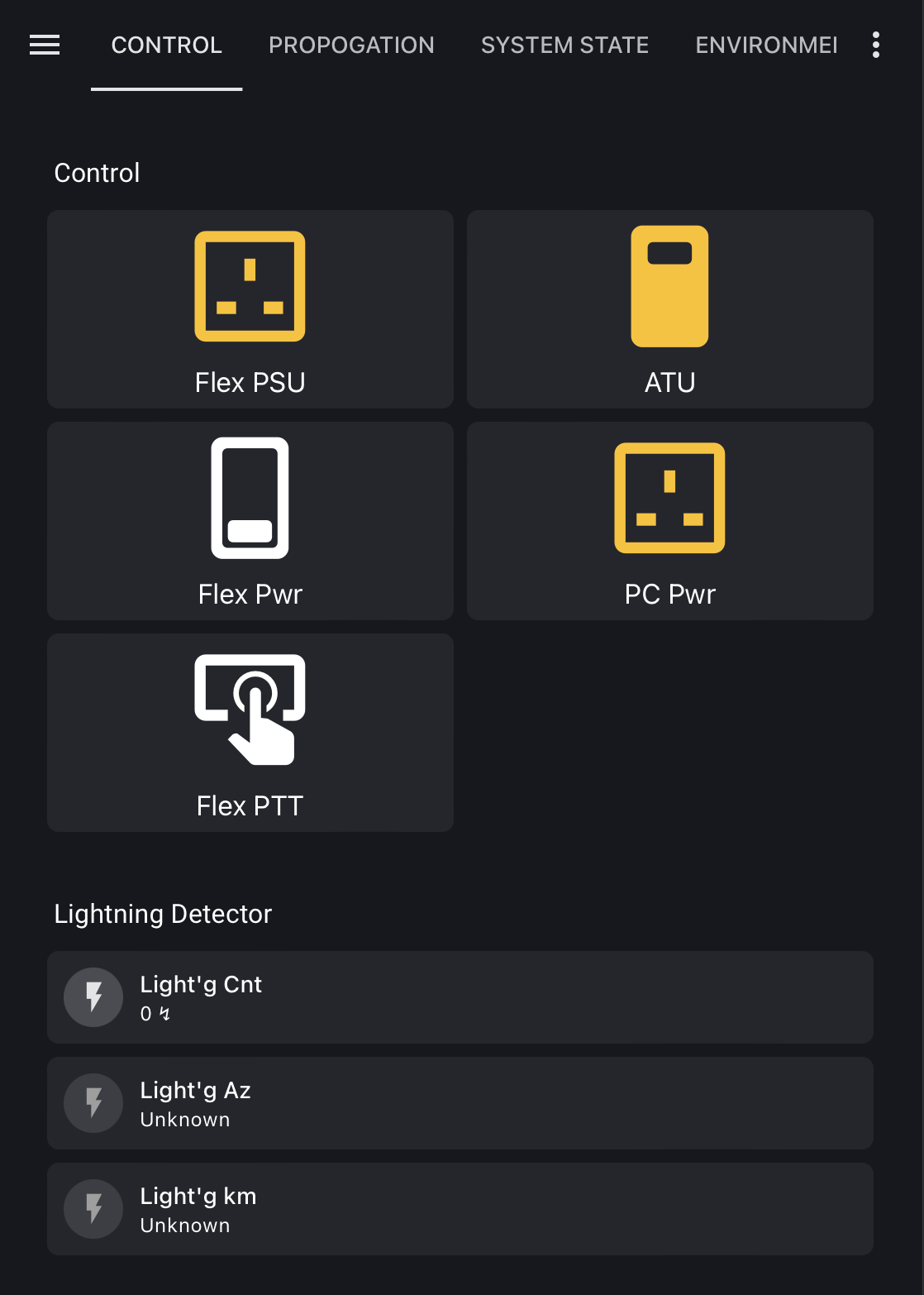 This is the main control screen as seen from a desktop or laptop. At the top are various status indicators, followed by the time and current propagation and then buttons to control the Flex PSU, the ATU, the Flex 6400 and the Windows PC that I use for digital modes.