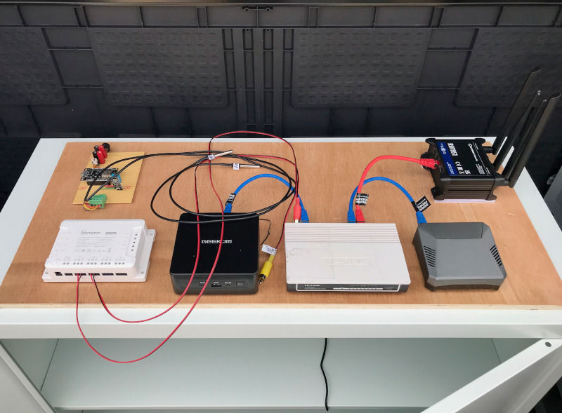 Top left is the ancillaries board with an input jack from the ancillary 12V PSU, a couple of Power Poles to feed other 12V devices, the ESP8266 running ESPHome and code for the environmental sensors – an on-board Temp/Humidity sensor for the internal cabinet, and two 1-wire temperature sensors that will be placed in the space between the two cabinets and outside. On the far right is the Teltonika RUT951 router. In the picture it has its internal aerials on, but in the field it will have the 4G antennas and one of the wi-fi antennas connected to external antennas.
